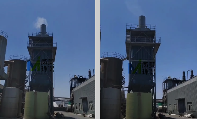 第一臺焦亞硫酸鈉尾氣治理現(xiàn)場效果圖,濕電除霧器恒流電源開機(jī)加檔后,效果非常顯著,下面是開機(jī)前后的對比效果