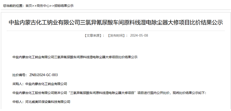 河北威美中標(biāo)中鹽內(nèi)蒙古三氯異氰尿酸車間濕電除霧器大修項目,以下是比價結(jié)果公告