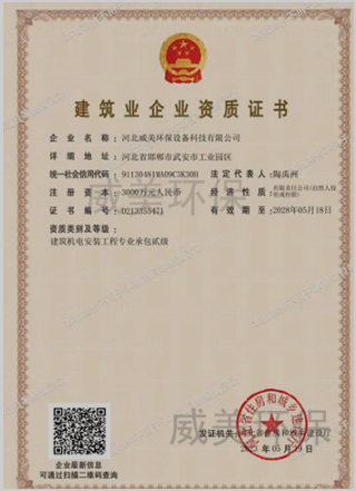 建筑業的企業資質證書是企業資產,是對威美人才力量與作業能力的肯定。河北威美環保設備是一家集設計、制造、安裝、調試濕電除霧器、脫硫設備于一體的高新型技術企業。河北威美環保堅持在尾氣治理設備制造領域中不斷創新發展,目前已有百余臺設備運行在燃煤鍋爐、金屬冶煉、氰尿酸、磷化工、生物質(糖廠/糠醛)鍋爐、高性能纖維、垃圾焚燒等領域。我們通過電話溝通,實地考察測量,為您的生產線量身定制尾氣治理方案。威美環保將持續深耕于煙氣治理設備制造領域,進一步加大技術的開發和創新力度,并不斷增強自身的核心競爭力,推動高質量的發展。